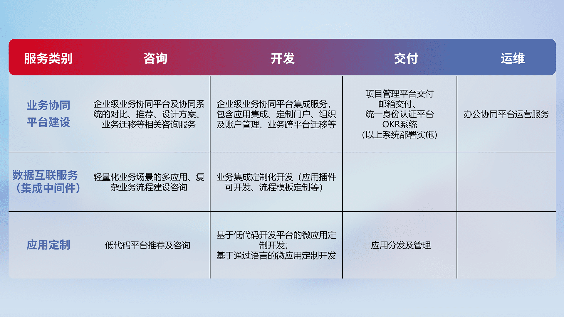 针对钉钉、、、企微、、IDaas等平台级产品提供产品的规划、、、方案、、、、交付、、、、定制化开发等服务,,,,实现如统一协同办公、、智能客户服务、、混合会议管理、、、智能数据查询、、、等业务场景,,,实现数字化转型。。。。