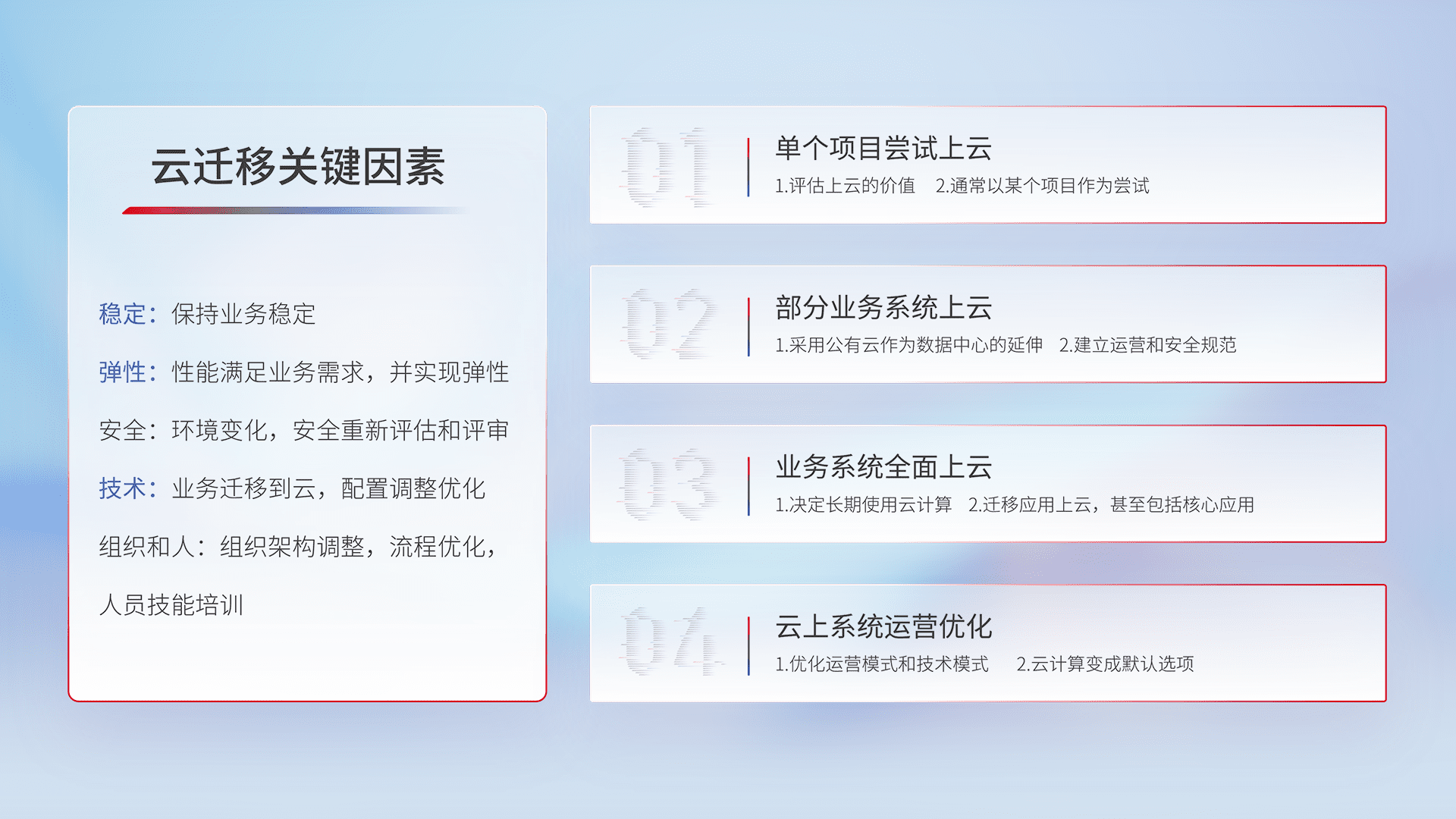 结合实际业务,,,从规划设计、、、、云平台选型、、云原生改造、、数据迁移、、、集成交付,,,迁移全过程为客户识别最佳上云路径,,做好风险识别管理,,设计网络架构、、、、身份权限、、、安全审计合规、、操作审计、、、日志审计、、、、监控告警策略、、、多站点容灾设计等,,,对云上基础设施进行整体规划,,提升IT治理水平,,,以满足弹性、、、高可用、、高性能的需求。。。。