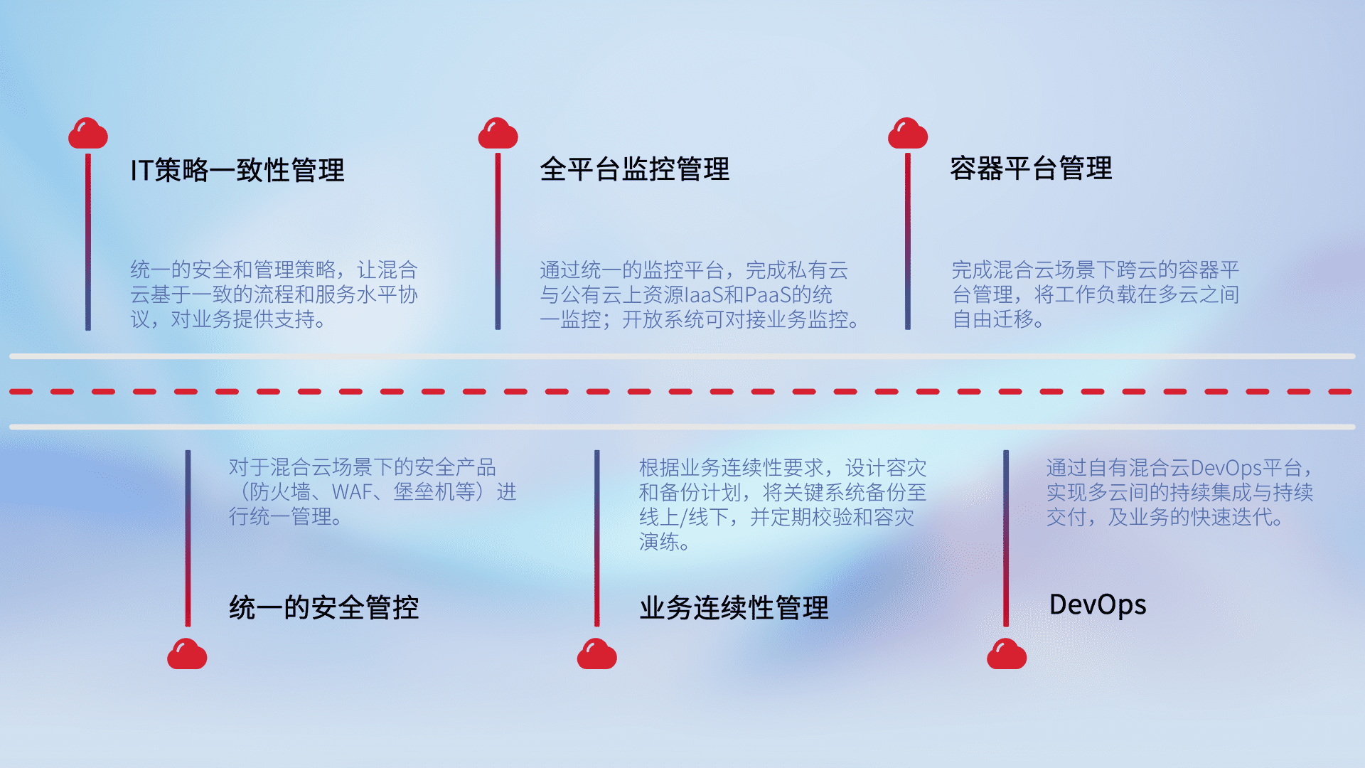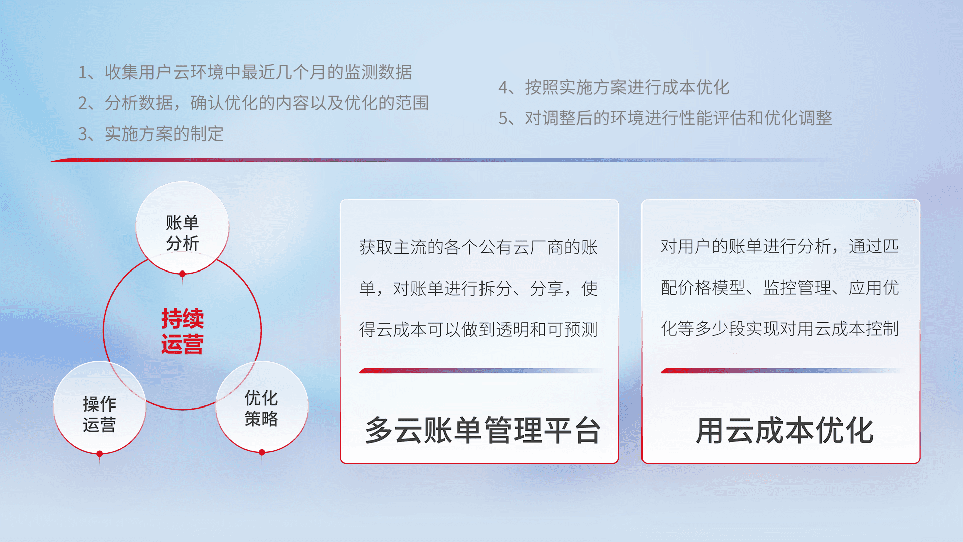 通过多云纳管,,,以统一的资源数据模型把客户的云资源进行抽象和封装,,进而实现对多云资源的统一操作,,,保障云资源管理的可靠性、、、、稳定性与可用性。。量身定制化运维内容,,配置、、、、开发运维、、、、补丁管理、、、备份、、、监控、、、认证和访问管理、、、审计和日常巡检等,,保障在用云过程中的可靠度,,稳定度以及高可用率。。。。